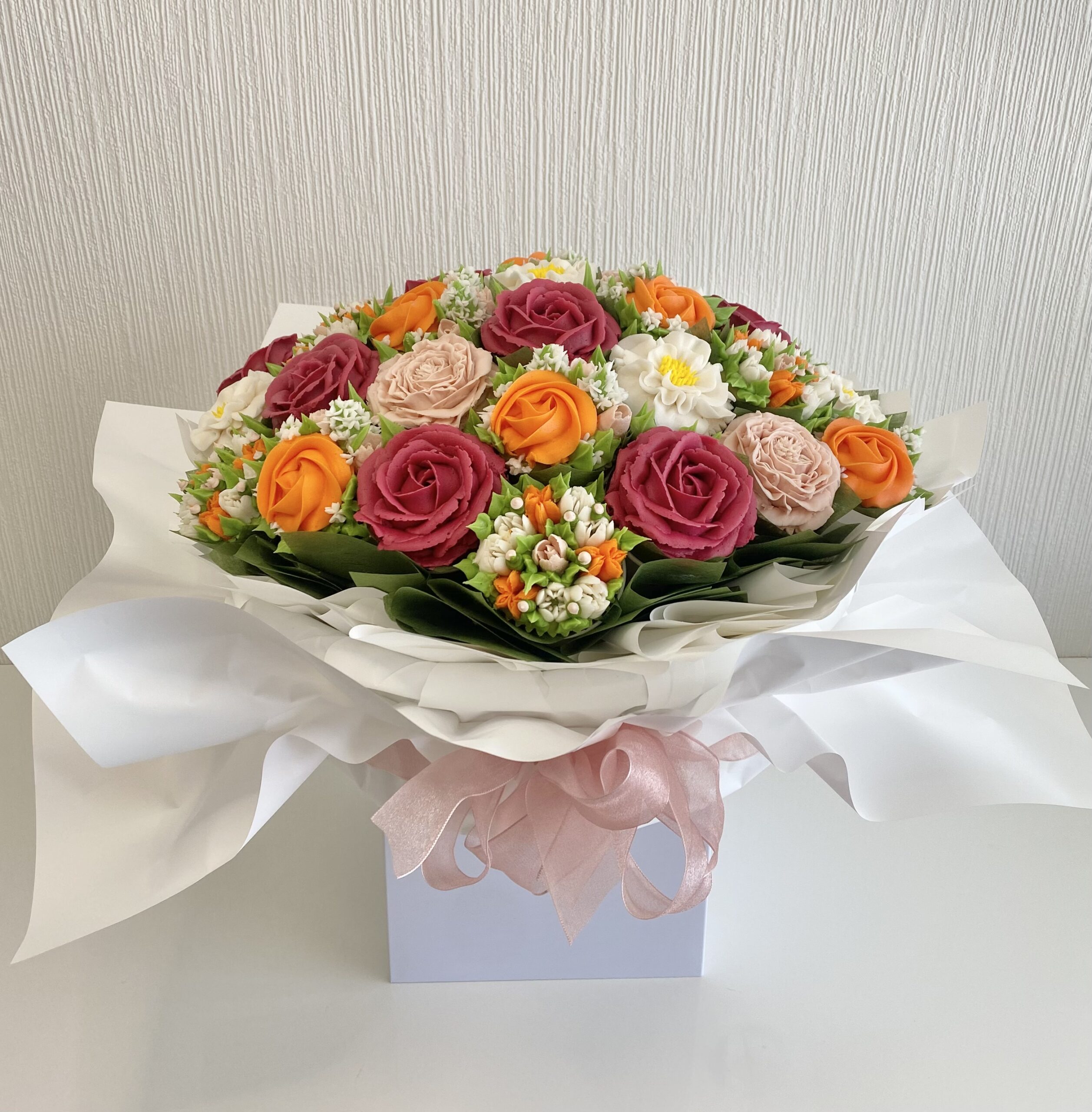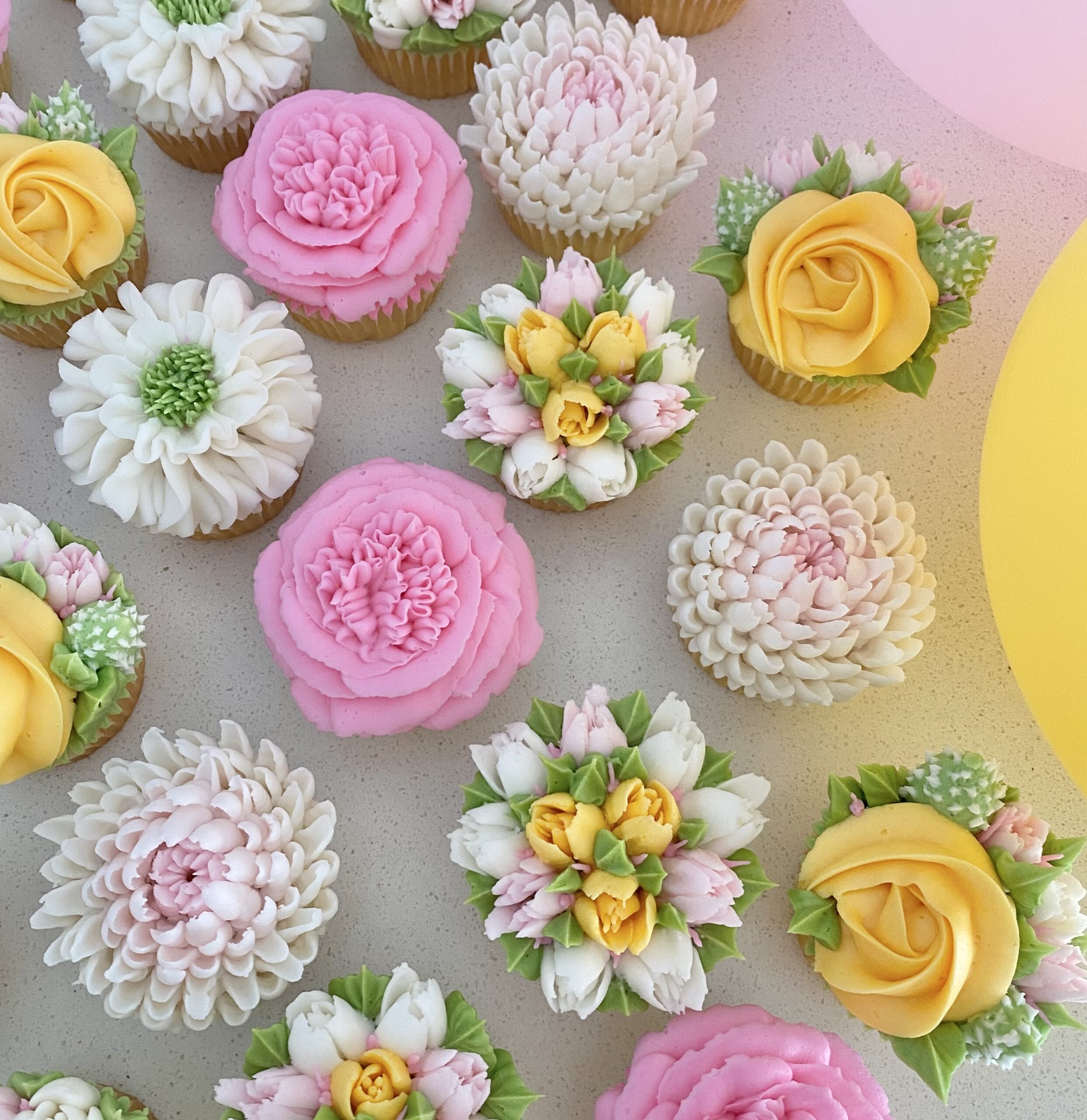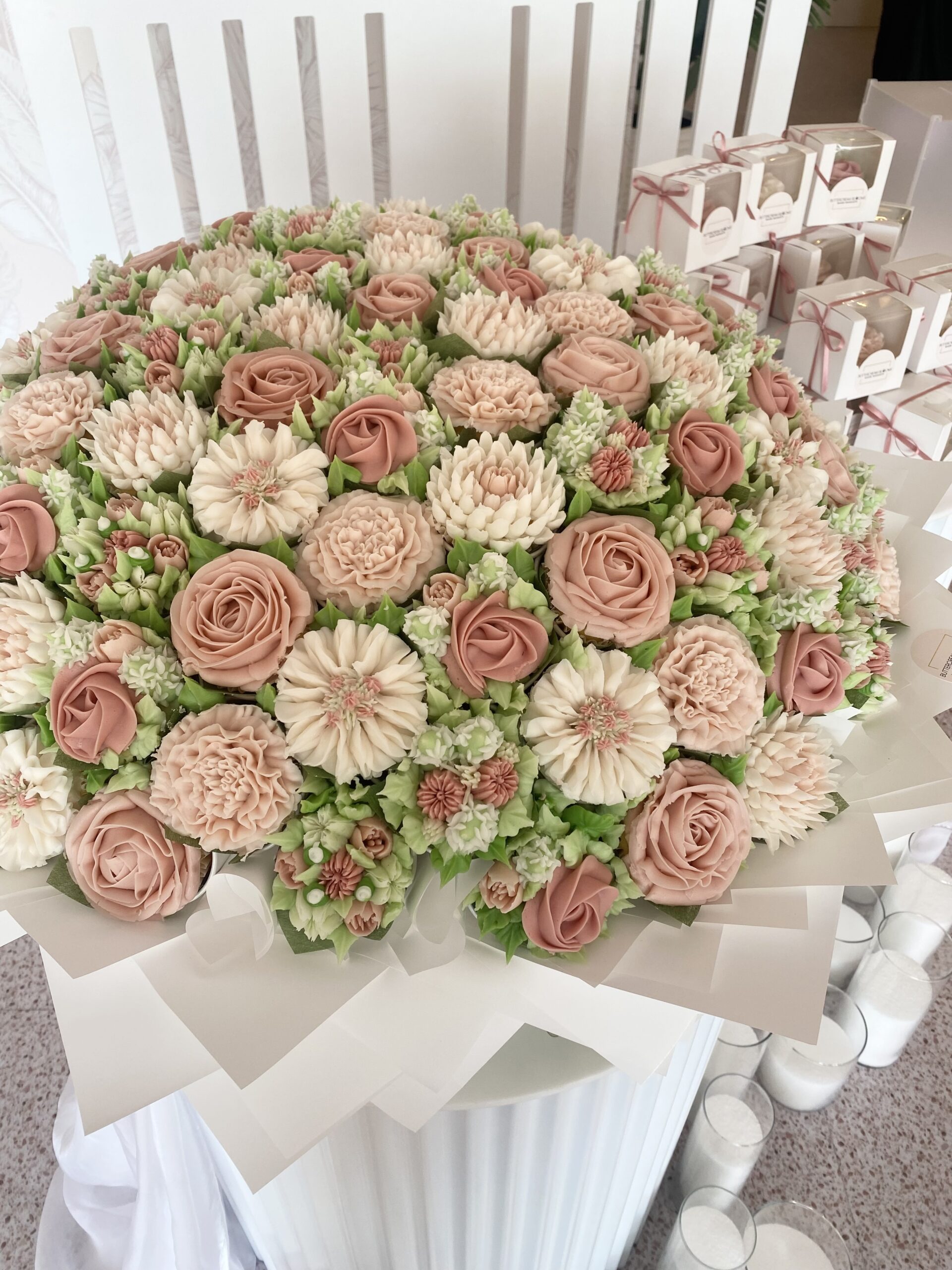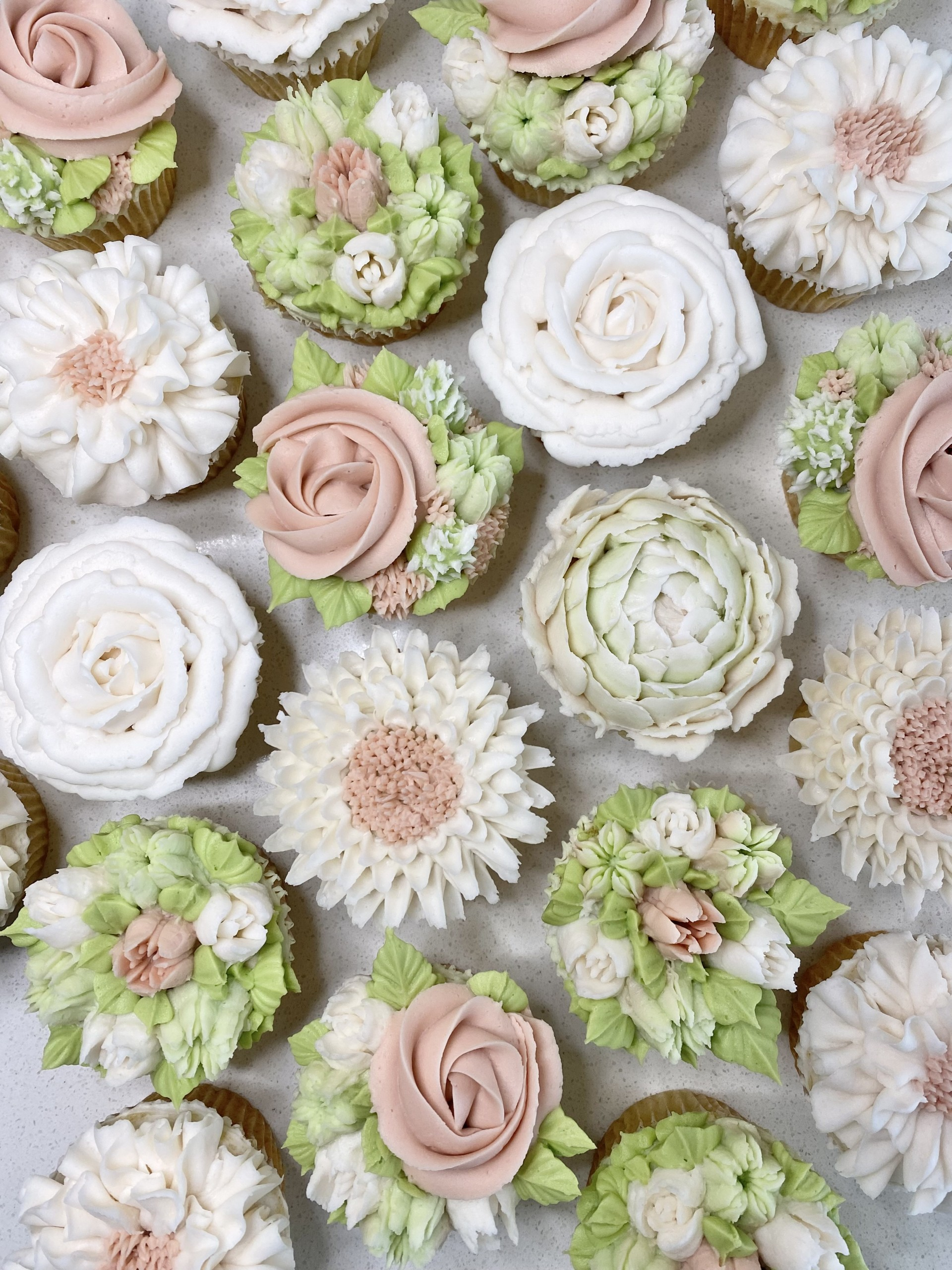 Our vanilla cupcakes are transformed into exquisite edible art, each one hand-piped with buttercream to resemble delicate florals perfect for any custom arrangements.